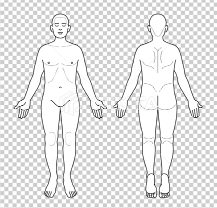 On the diagram, shade in the areas where you feel pain. Put an X on the area that hurts the most.